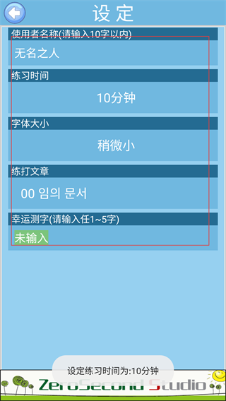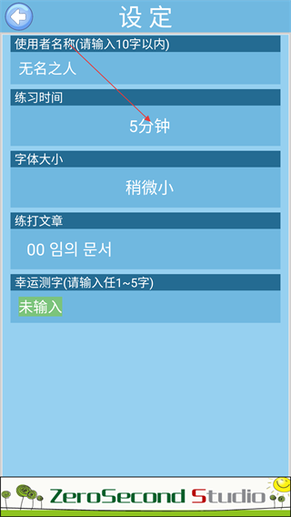 2、打开【设定】界面,其中【使用者名称-请输入10字以内】可进行编辑,【练习时间】目前默认设置为【5分钟】,此外还能够对其他参数进行调整。