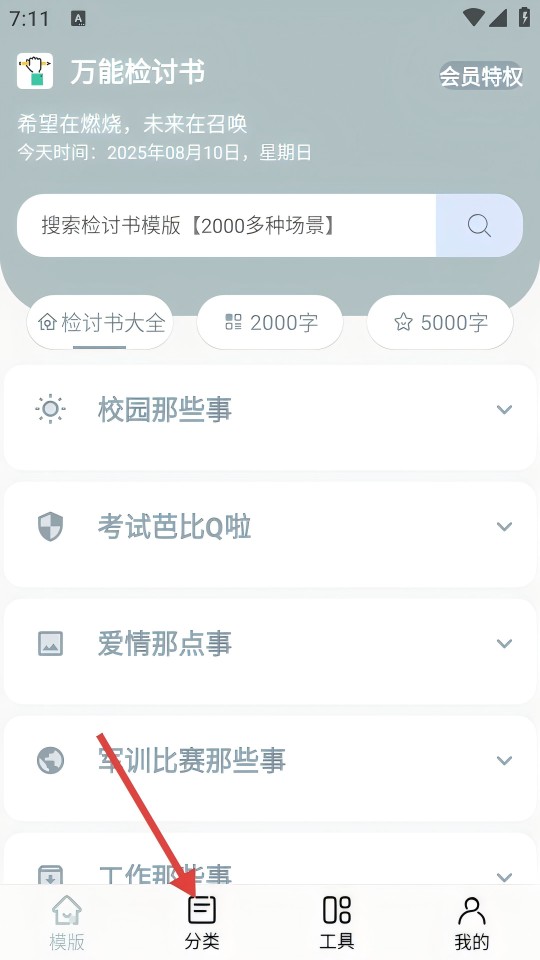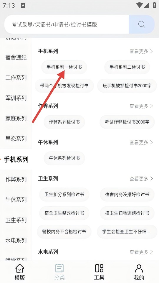 1、在模板页点击【分类】按钮,进入分类导航页面后,查找【手机系列—检讨书】这类细分的模板类型。