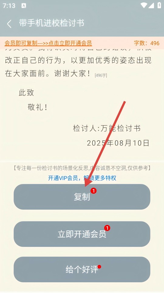4、在范文页点击【复制】按钮,即可完成内容复用;若想解锁更多特权,可选择开通会员。
