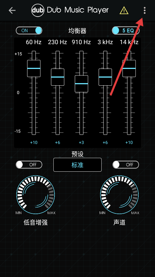 2在均衡器设置页面,找到右上角的三点形状按钮并点击,即可打开更多功能选项。