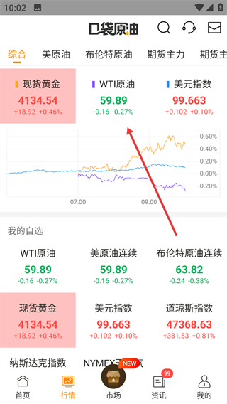 3、在行情页面挑选目标原油品类,例如【WTI原油】。