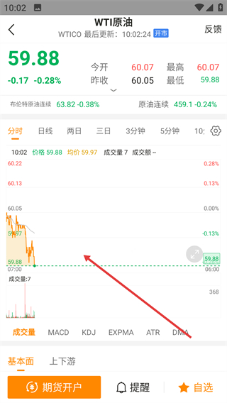 4、进入WTI原油详情页面,查看其价格、分时走势等信息,完成原油行情查询操作。