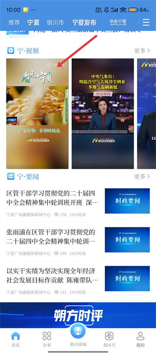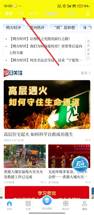 1、打开黄河云视App后,在首页点击顶部的【宁夏】选项就能切换频道啦。