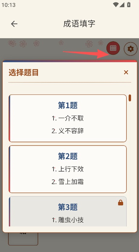 2填字游戏的设计和学习紧密联系,用空词的方式展示成语。搭配问题挑选功能,能够灵活选定练习材料,提升习语学习的趣味性和针对性。