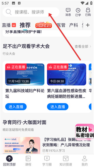 1、打开【呗呗医生】软件,点击顶部搜索框,输入关键词,开启课程搜索之旅哦。