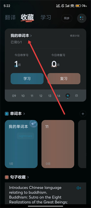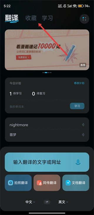 1、我们可以点击【收藏】标签,进入收藏板块,这里能管理单词本和收藏句子,方便整理学习内容呢。