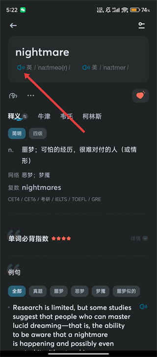 4、进入单词详情页后,点击发音图标,可听【nightmare】的英美发音,助力单词发音学习哟。