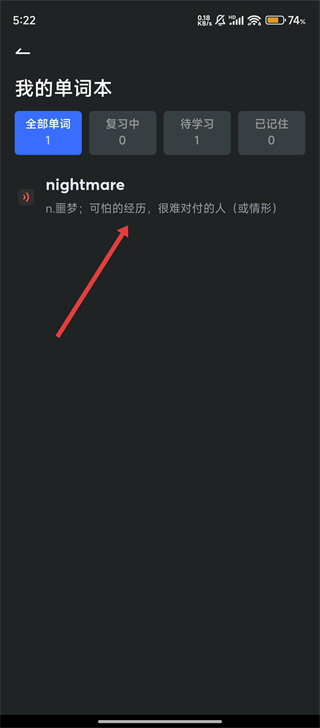 3、在我的单词本里,点击单词【nightmare】,进入其详情页,能查看释义等信息啦。
