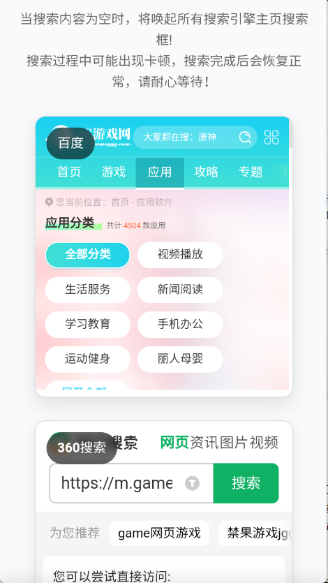 3、集成多个搜索引擎,如百度、360搜索等,为用户提供更全面的搜索结果,满足不同搜索需求。