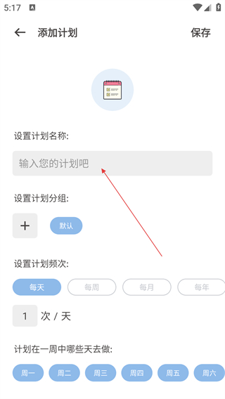 3、进入【添加计划】页面,填写【计划名称设置】项,选定分组、频次等相关信息后,点击【保存】按钮。