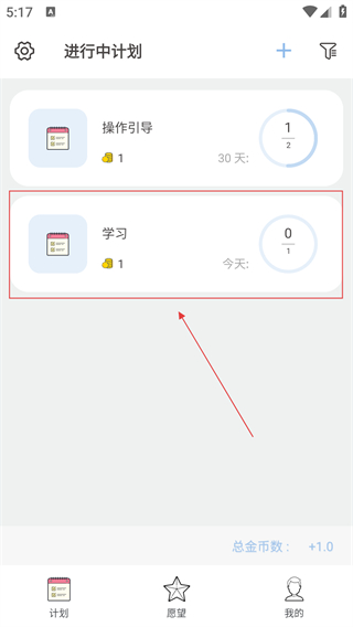 4添加操作完成后,在“进行中计划”页面会呈现刚创建的新计划(例如“学习”),并且能够查看该计划的进度情况。