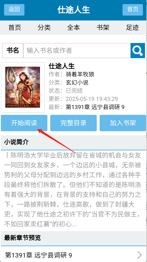 4找到目标小说后进入其详情界面,接着点击启动阅读的按钮。