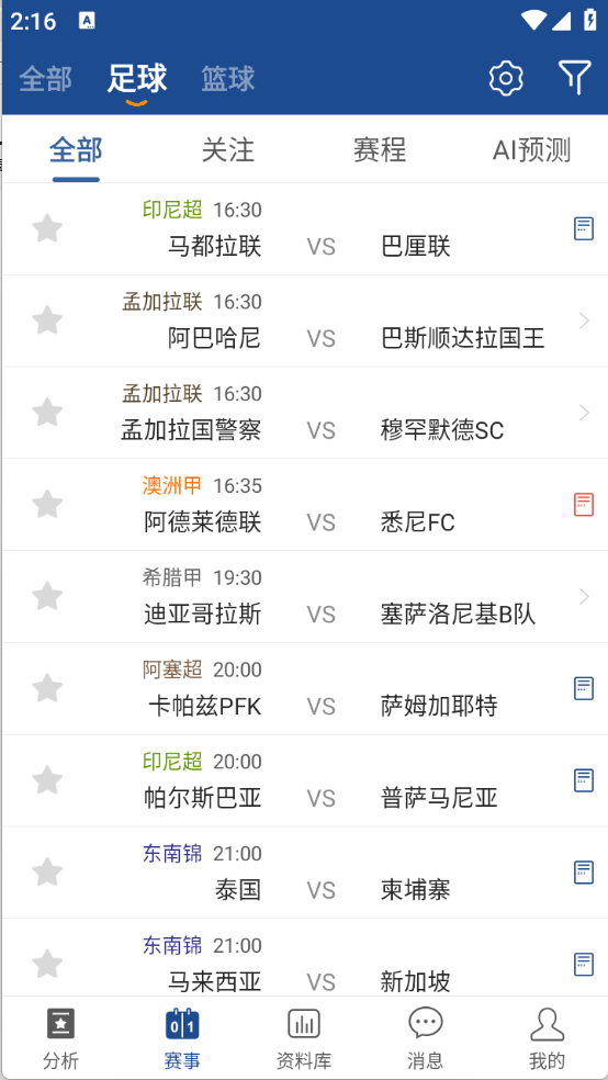 2、赛事栏目提供了当前全部的赛事,包括足球和篮球,还可以查看比分详情、ai预测等板块。