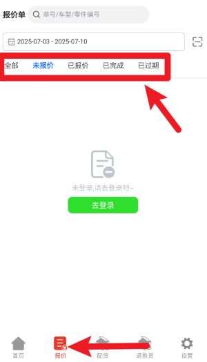 3在页面底部找到“报价”相关按钮并点击,即可进入报价单查看界面,该界面提供多种状态筛选功能,包括未报价、已报价、已完成以及已过期等不同类型的报价单筛选选项。