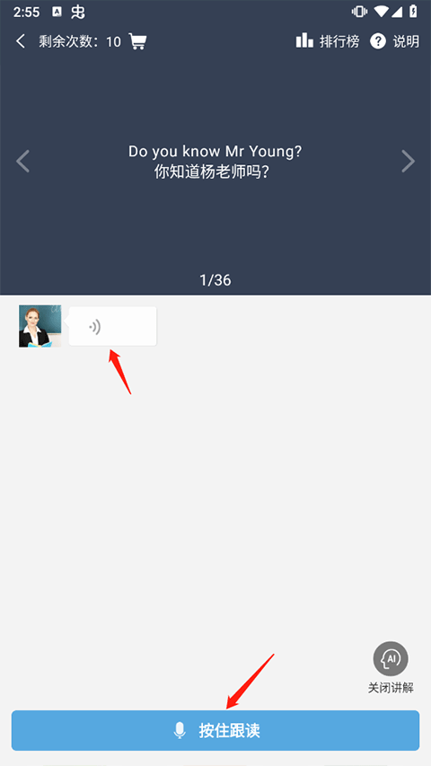1当你进入跟读学习的界面后,就可以利用其中的长按录音功能来进行跟读录音操作了。