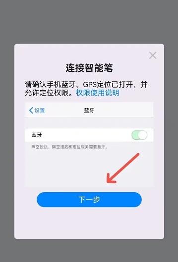 2当弹出连接智能笔的提示界面后,先开启蓝牙功能,再点击界面上的下一步按钮继续操作。