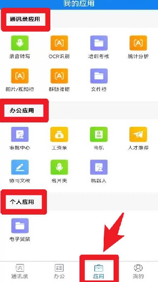 4该应用的界面布局涵盖了联系人管理、日常办公及个人服务三大板块,同时集成了语音记录转文字等多种便捷实用的工具。