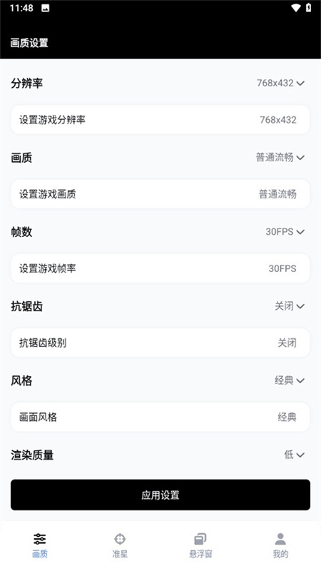 2、如图所示,若工具箱主界面上方的游戏版本栏不再显示,意味着游戏版本已选定完成。之后只需设置好分辨率、画质、帧数等相关选项,再点击界面下方的【应用设定】按钮,就能完成设置的保存操作。