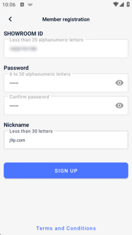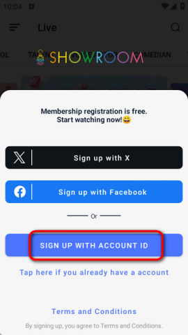 1. 首先下载并安装SHOWROOM应用。打开软件后,若你尚未注册账号,可点击界面中间的蓝色注册按钮进行注册。