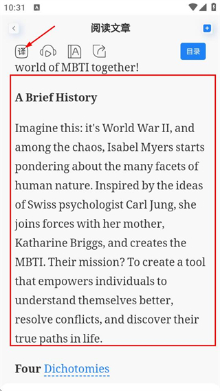 3、在文章阅读页面就能直接阅读文章,若想查看中文内容,点击左上角的翻译按钮即可。