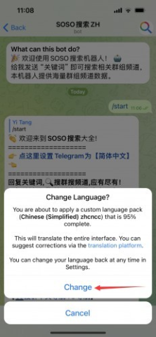 3进入聊天页面后,找到那条蓝色的引导链接,标题是关于把Telegram调整为简体中文的,最近对手动切换语言没什么耐心,通过这个链接就能直接完成设置了。