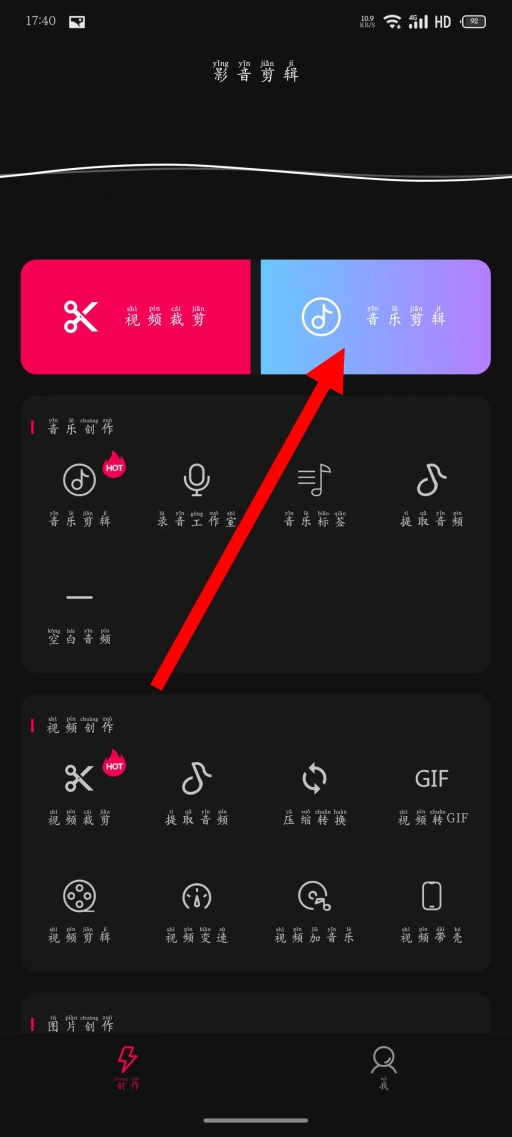 2、进入音乐剪辑页面后,点击右上角添加音乐。