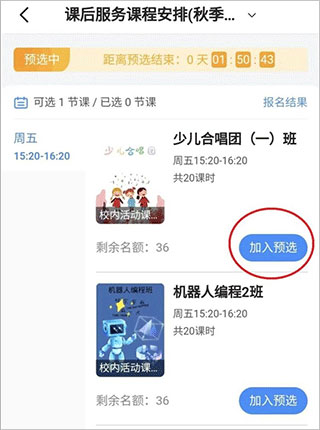 3、预选时间段内,家长可将心仪的课程加入预选清单。预选结束时,若该课程预选人数未达报名人数上限,则系统会在预选结束后自动提交报名,报名阶段无需家长手动报名。
