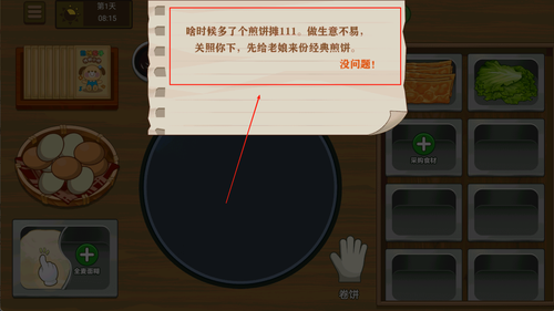 1游戏开始就能直接进入煎饼制作的摊位界面,通过点击或滑动屏幕来完成面糊摊开、打入鸡蛋、添加配料等操作,根据顾客的具体需求迅速完成对应的订单。