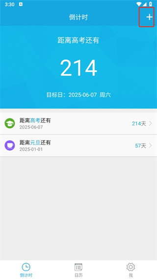 1、在移动设备上找到并启动新高考倒计时应用,待应用加载完成后进入其主界面。 2、在主界面的右上方区域,找到并点击带有加号标识的按钮。