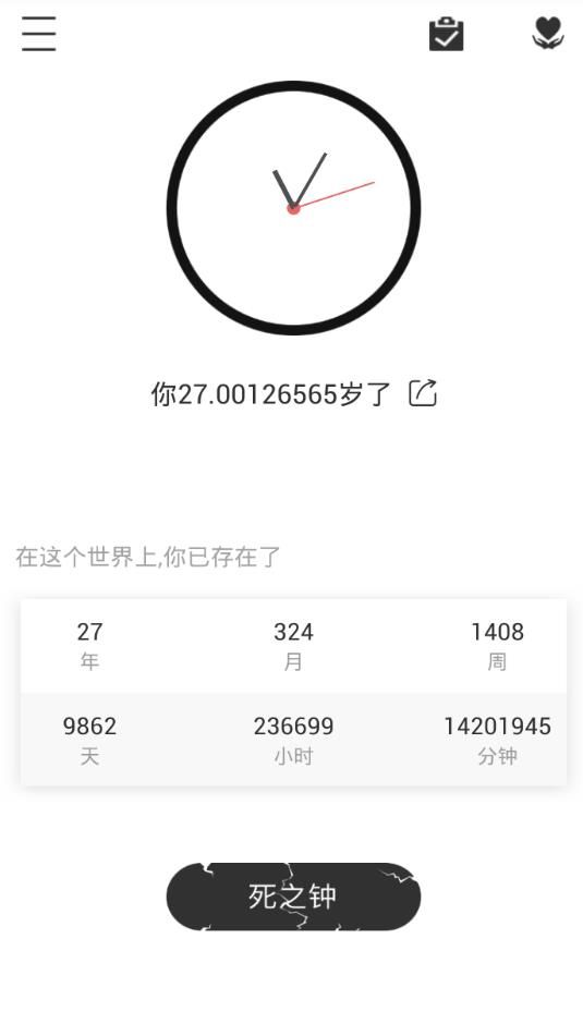 2、用户登录成功后,需要选择自己的出生日期,点击确定后进入主页面。在主页面里,不仅能看到自己的实际年龄,还能了解到自己在这个世界上存在的时长,具体会精确到年、月、周、天、小时和分钟呢。
