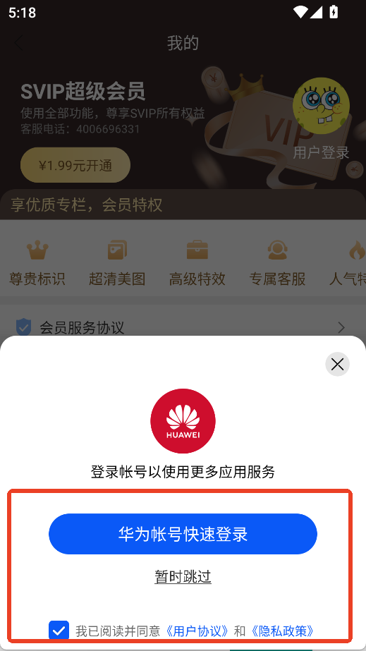 3、系统随即弹出登录窗口,用户需勾选服务协议后登录账号