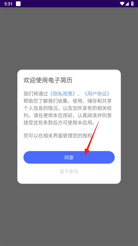 1、打开进入电子简历中,同意用户协议以继续使用。