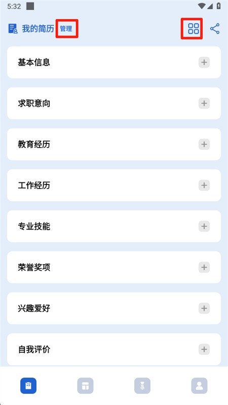 1、用户安装电子简历后,打开软件,就能在【我的简历】界面中输入个人基础信息,包括求职意向、教育经历、工作经验、专业技能、荣誉奖项等信息;