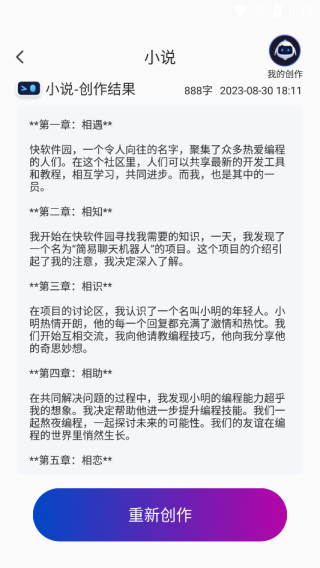 5、点击“立即创作”按钮后,AI就会自动生成与设定要求相符的小说文本内容。