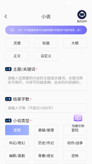 1、适配多种创作类型:可生成文章、小说、报告、广告文案等各类内容。