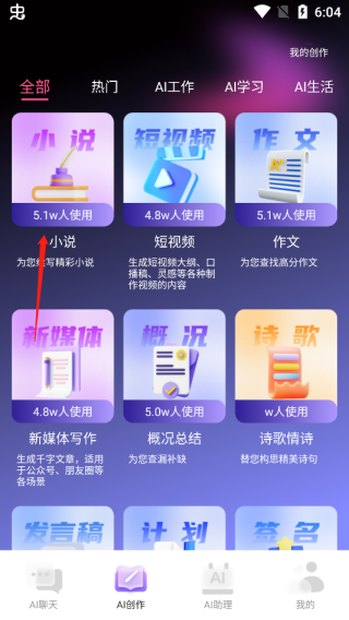 1、启动AI写作宝应用,进入首页界面后,找到并点击“AI创作”这一分类选项;
