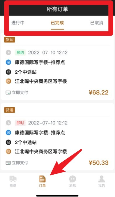 4. 点击底部的“订单”标签即可进入订单管理页面,在这里可以按照“进行中”“已完成”“已取消”的分类来浏览所有运输订单。