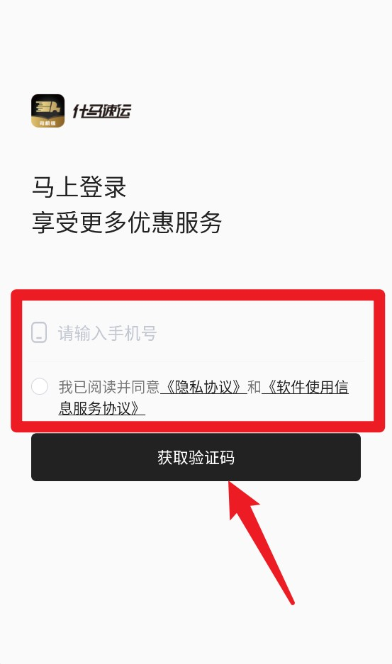 1. 在首页找到“请输入手机号”的输入框并点击,输入手机号后勾选相关协议,再点击“获取验证码”按钮,即可完成快捷登录操作。