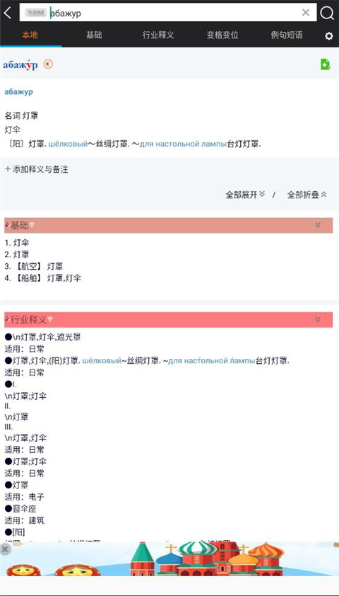 3该功能支持俄语与汉语之间的双向查询,涵盖基础词义、专业领域释义、实际用例、发音重音标注以及词汇的形态变化和变格信息等内容。
