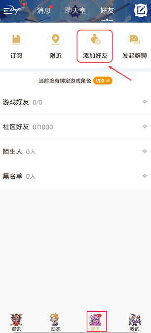 1、启动DNF助手应用,点击底部导航栏中的“聊天”按钮;
