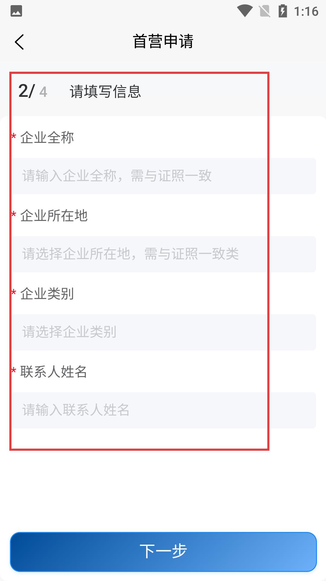 4、进行首营申请的信息填写时,需录入企业全称、所在地、类别以及联系人姓名等必填项信息,填写完毕后点击【下一步】按钮以推进后续流程。