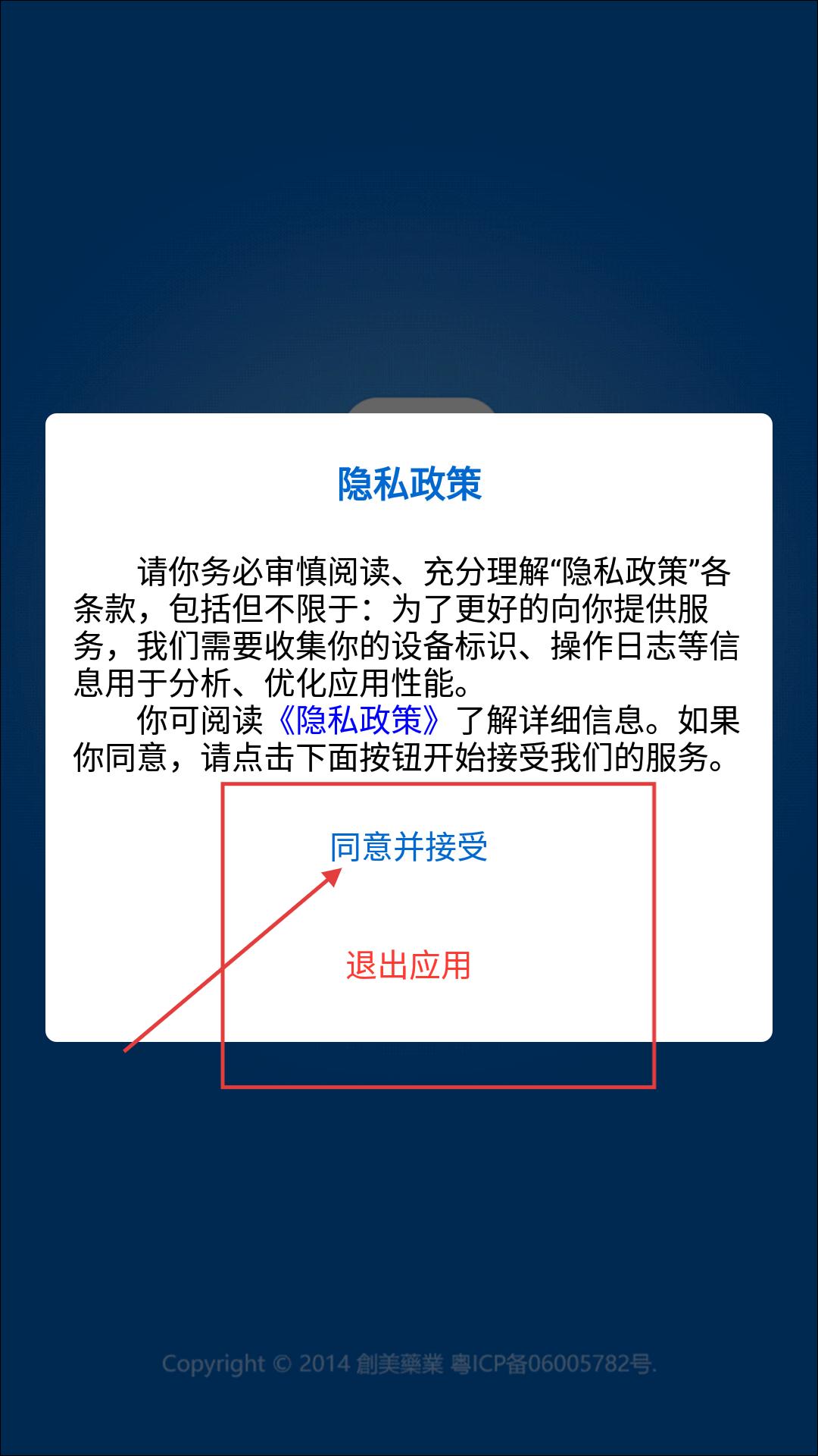 1在隐私政策页面,要仔细阅读相关条款内容,若认可条款内容可选择“同意并接受”按钮来继续使用服务,若不认可则可点击“退出应用”按钮。