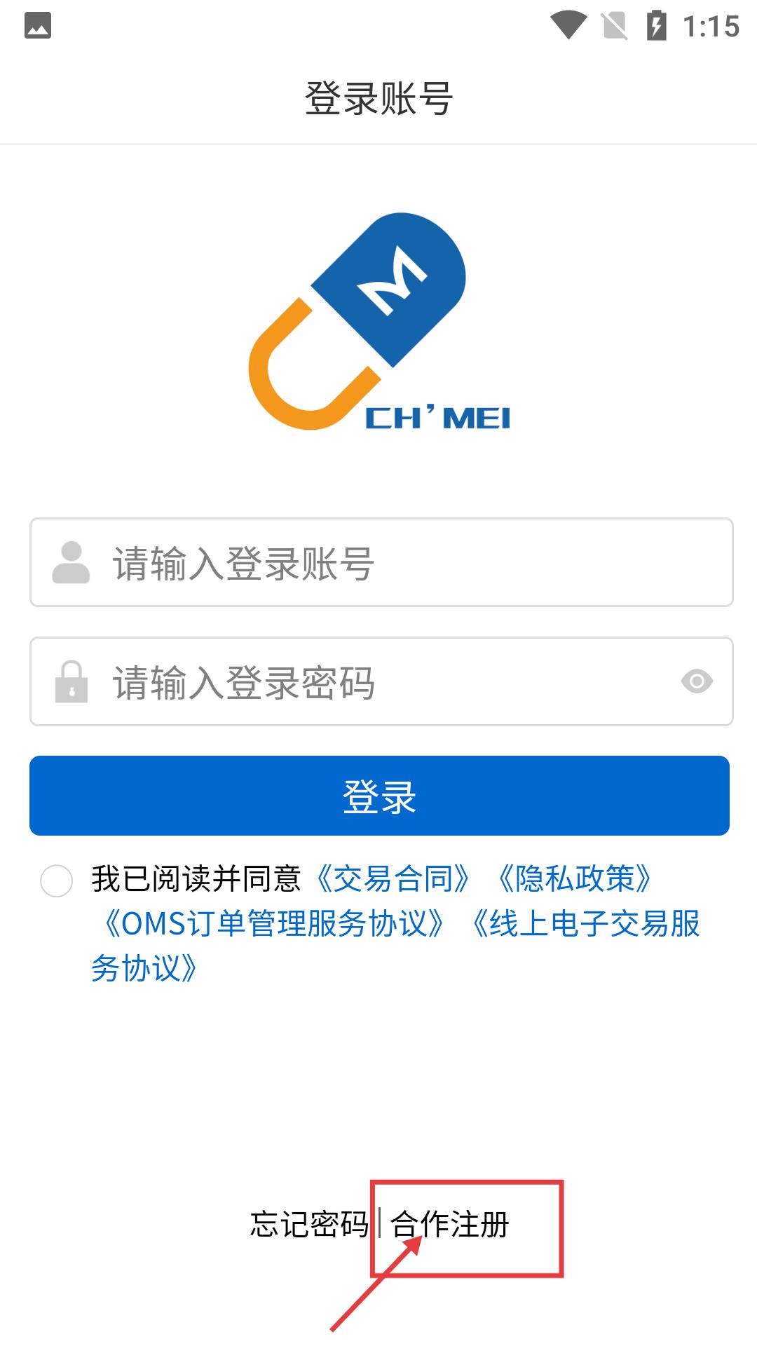 2在账号登录页面,用户既能输入已有账号和密码完成登录操作,也能通过点击【合作注册】按钮来新创建账号;若用户忘记密码,可选择对应的找回选项进行密码重置。
