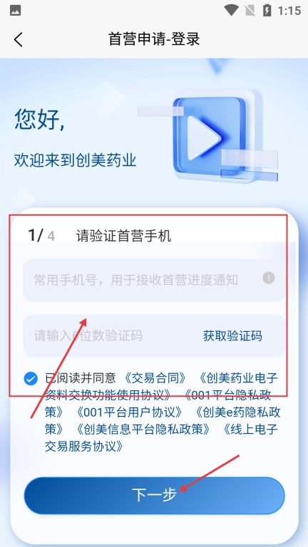 3、在首营申请的登录步骤中,需要输入常用手机号码来获取并填写验证码,勾选同意相关协议后点击【下一步】按钮。