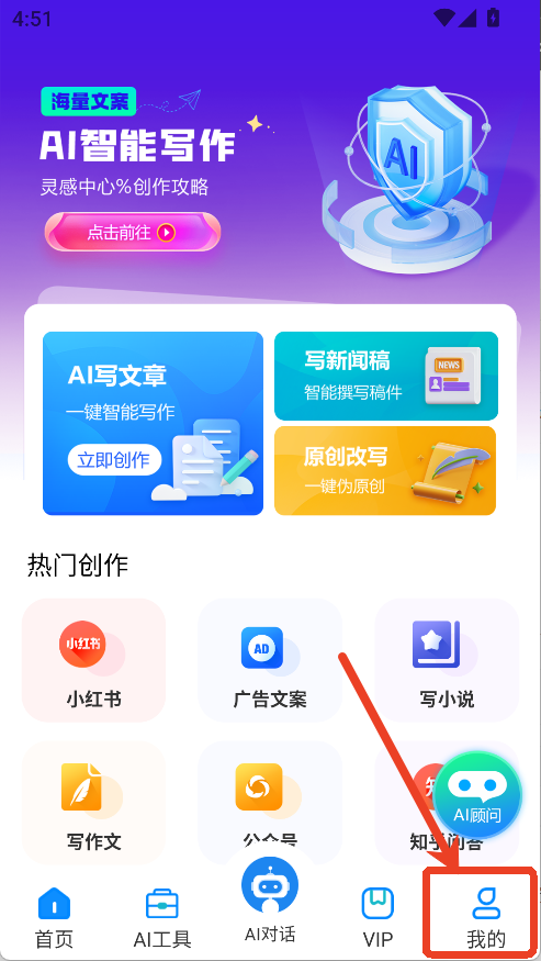 1、打开AI智能写作助手,用户可在首页中使用各种功能,这里以【AI写文章】为例