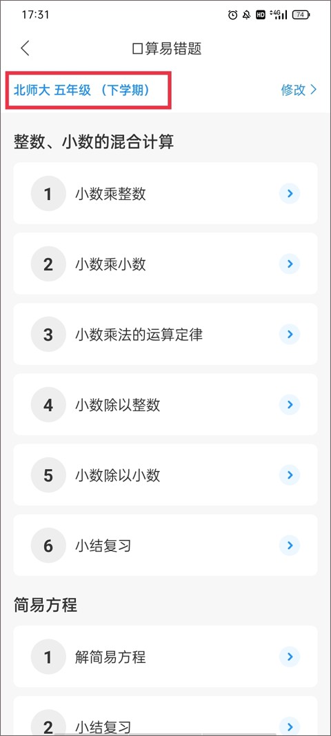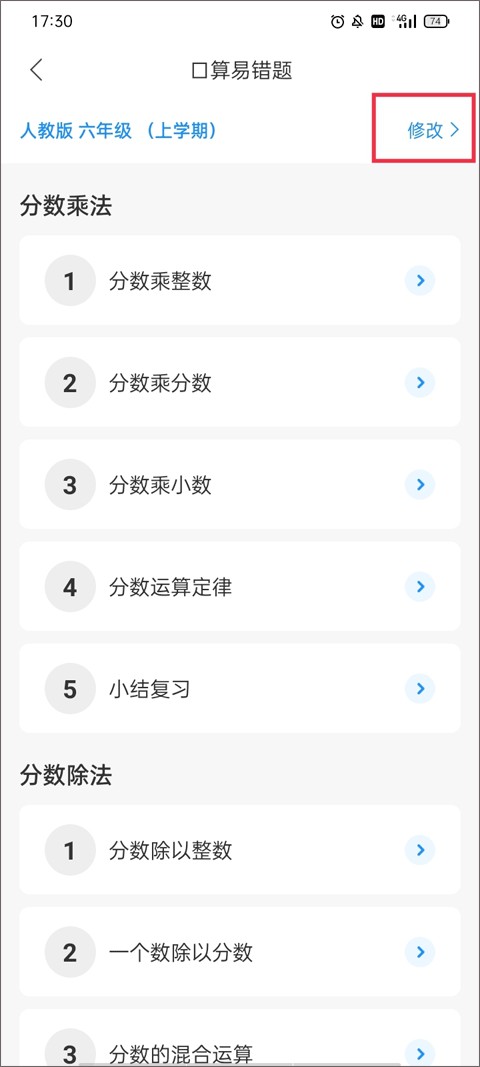 2、进入口算易错题界面后,你能看到具体的数学知识点练习内容。要是想重新调整练习范围,点击右上角的“修改”按钮就行。