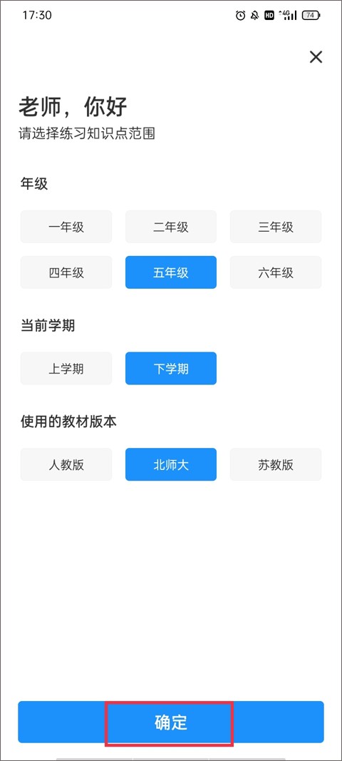 3、用户可从年级、当前学期和所用教材版本方面进行设置,完成设置后点击“确定”按钮即可。
