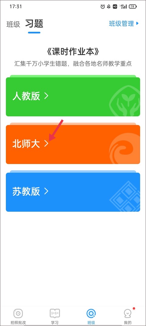 1、打开爱作业后,点击底部菜单栏的【班级】选项,进入习题页面。在这里,你能找到人教版、北师大版和苏教版等数学教材版本,选择其中一个教材点击即可。