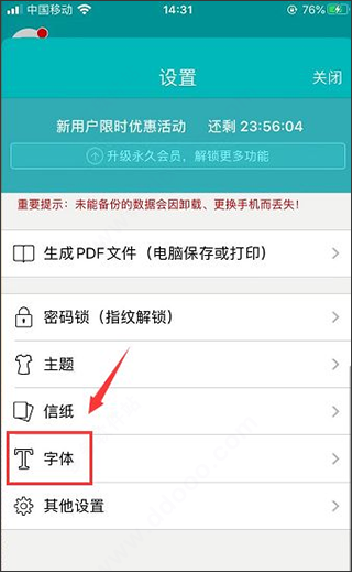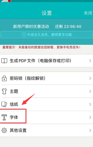 2、在开启的设置页面中找到“字体”功能选项,点选。