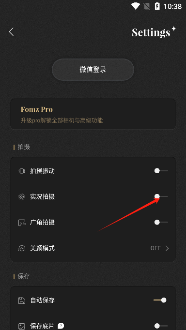 2、在弹出的选项中勾选“实况拍摄”功能。